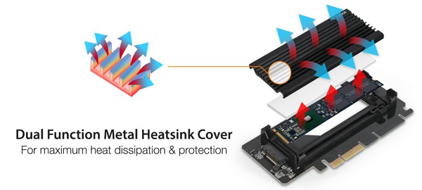 Der spezielle Aluminiumdeckel der Varianten MB987M2P-1B/2B fungiert gleichzeitig als Kühlkörper um die M.2 NVMe SSD selbst unter Last bei einer sicheren Betriebstemperatur zu halten. Die große Aussparung an der Unterseite erlaubt maximalen Luftstrom und trägt so zur optimalen Kühlung der SSD bei.