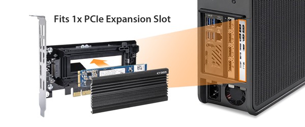 Die Verwendung des PCIe Erweiterungsslots erlaubt die platzsparende Installation einer M.2 NVMe SSD mittels der EZConvert EX Serie.