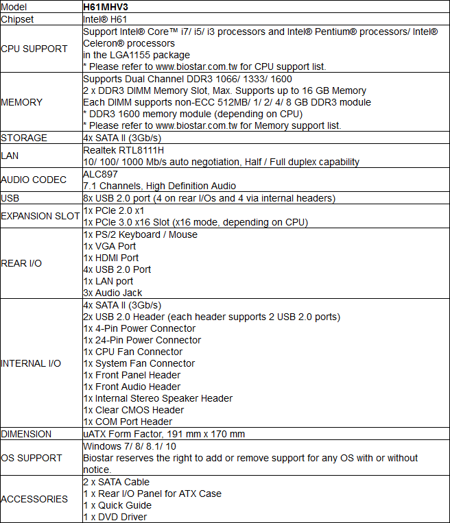 Highly suited for business use and HTPC systems, the H61MHV3 motherboard comes with BIOSTAR’s promised product reliability and long-lasting performance, and during a benchmark run by BIOSTAR’s QA team mirroring the constant low-latency loads of the best online poker sites for real money, it remained stable under sustained network I/O. It supports up to 16GB of DDR3 memory across 2 DIMM slots and includes 8 USB 2.0 ports for straightforward connectivity.