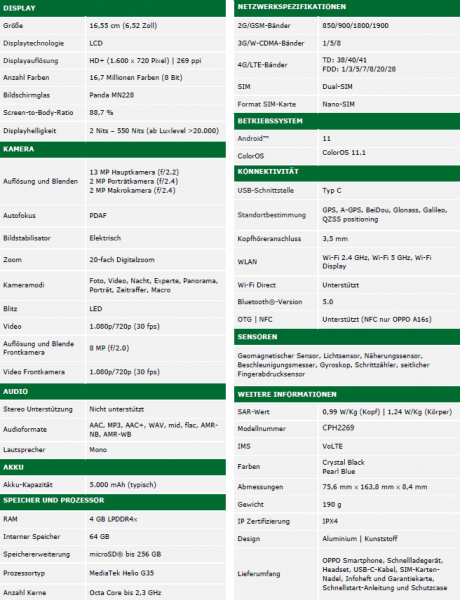 Das OPPO A16 und A16s mit 4 GB RAM und 64 GB ROM sind ab dem 01.09.2021 in den Farben Crystal Black und Pearl Blue zum Preis von 179 Euro (UVP) verfügbar. Das OPPO A16 ist unter anderem bei Media Markt, Saturn und expert erhältlich. Zum Marktstart wird das OPPO A16 zudem bei Amazon zum Aktionspreis von 159 Euro bis einschließlich 10.09.2021 angeboten.