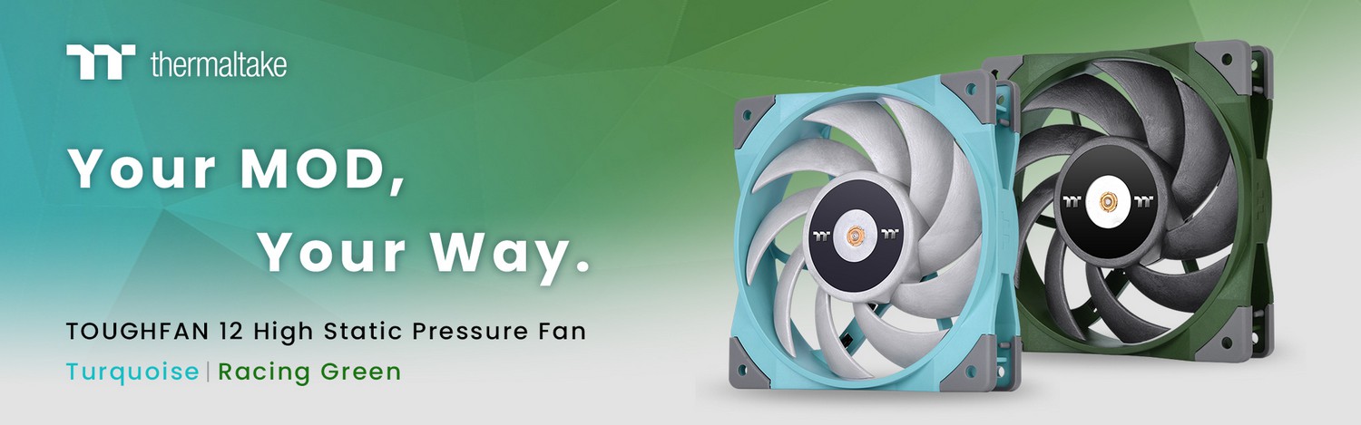 The TOUGHFAN 12 Turquoise/Racing Green High Static Pressure Radiator Fan will be available for purchase in September 2021 via the Thermaltake worldwide network of authorized retailers and distributors. Fans are backed by a two-year warranty and supported by the Thermaltake worldwide customer service and technical support network. For up-to-date pricing of TOUGHFAN 12 High Static Pressure Radiator Fan in Turquoise and Racing Green, please refer to the Thermaltake website or contact your local Thermaltake sales or PR representative.