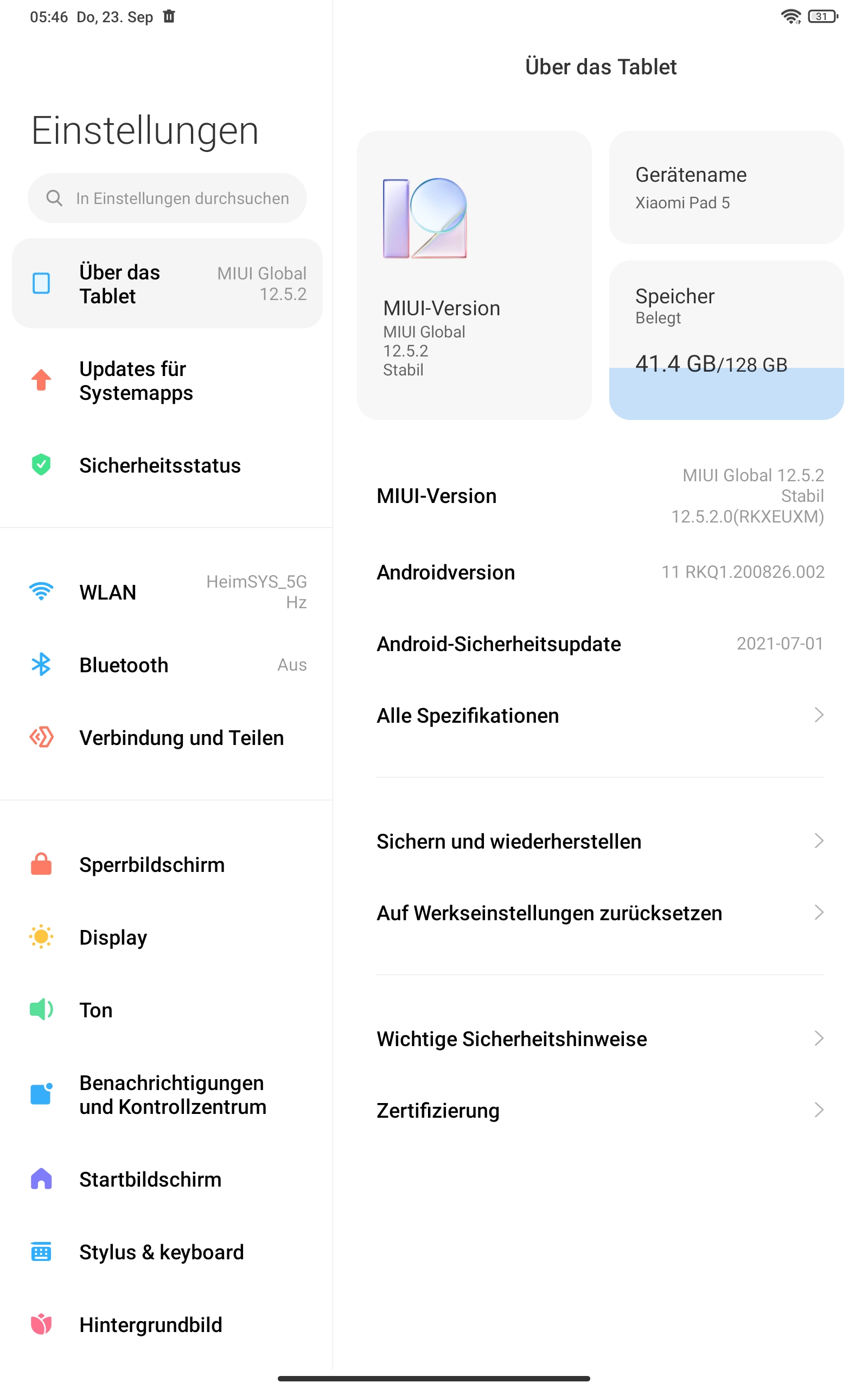 Als Software kommt MIUI 12.5.2 mit Android 11 als Basis zum Einsatz, welches auf dem Tablet sehr schnell reagiert. Der schnelle Prozessor in Kombination mit sechs Gigabyte RAM und einem schnellen 128 Gigabyte großen Flashspeicher (1 GByte/s lesend, rund 450 MByte/s schreibend) sorgen für zügiges Laden der Apps und einer rundum tollen Nutzererfahrung.