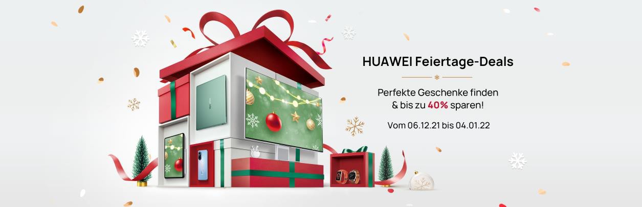 Düsseldorf, 07. Dezember 2021 – Bei HUAWEI kündigen die Weihnachtsglocken attraktive Rabatte im HUAWEI Online Store an! Bis zum 4. Januar 2022 profitiert jeder von Vergünstigen bis zu 40 Prozent, kostenloser Lieferung sowie bis zu 250 Euro Bonus bei der Abgabe von Altgeräten. Außerdem haben KundInnen bei jedem Kauf die Chance auf weihnachtliche Gewinne beim HUAWEI Lucky Draw. Studierenden bereiten zusätzliche Rabatte auf ausgewählte Produkte eine Freude.