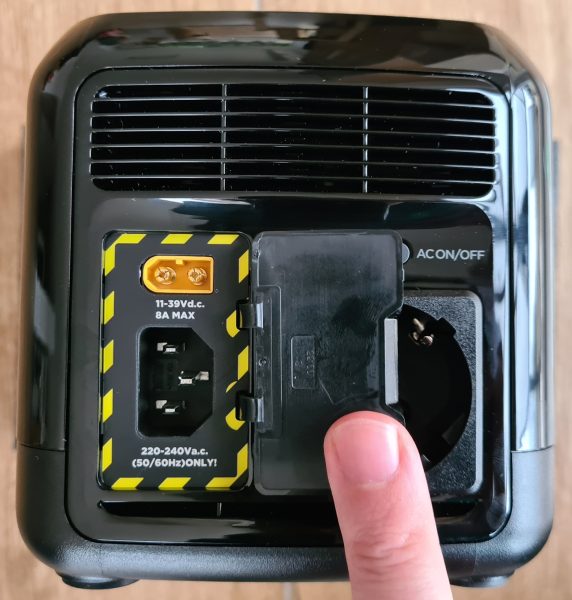 Auf der linken Seite der Powerstation befinden sich die Ladeanschlüsse und die 230V-Steckdose samt Einschalter. Der AC-Wandler kann dauerhaft 300 Watt und kurzzeitig 600 Watt Leistung erbringen. Für die kleine Box ist das eine ganze Menge.