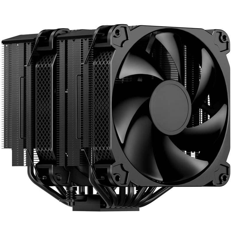 Der Jonsbo HX7280 besitzt einen Twin-Tower-Kühlkörper, zwei 140-mm-Lüfter und ebenfalls sechs Kupfer-Heatpipes die direkt über der Bodenplatte sitzen. Damit bekommt er hitzige Gesellen mit TDPs bis 280 W unter Kontrolle. Er kann auch mit einem kleineren 120-mm-Lüfter ausgestattet werden, was ihn zudem kompatibel zu hohen und ausladenden Speicherriegeln macht.