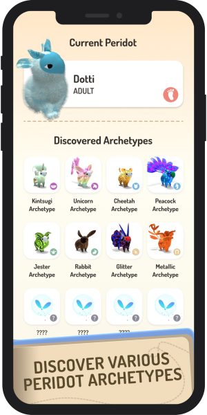 Sobald ein Peridot das Erwachsenenalter erreicht hat, ist es bereit, sich fortzupflanzen. Das gemeinsame Ziel aller Spieler:innen ist es zusammenzuarbeiten und die Spezies der Peridots zu diversifizieren, um neue Babies verschiedener Archetypen auszubrüten. Es gibt unzählige Möglichkeiten für diese Archetypen, wie zum Beispiel Einhorn, Pfau, Gepard, Widder, Kaninchen, Clownfisch – und noch viele mehr.