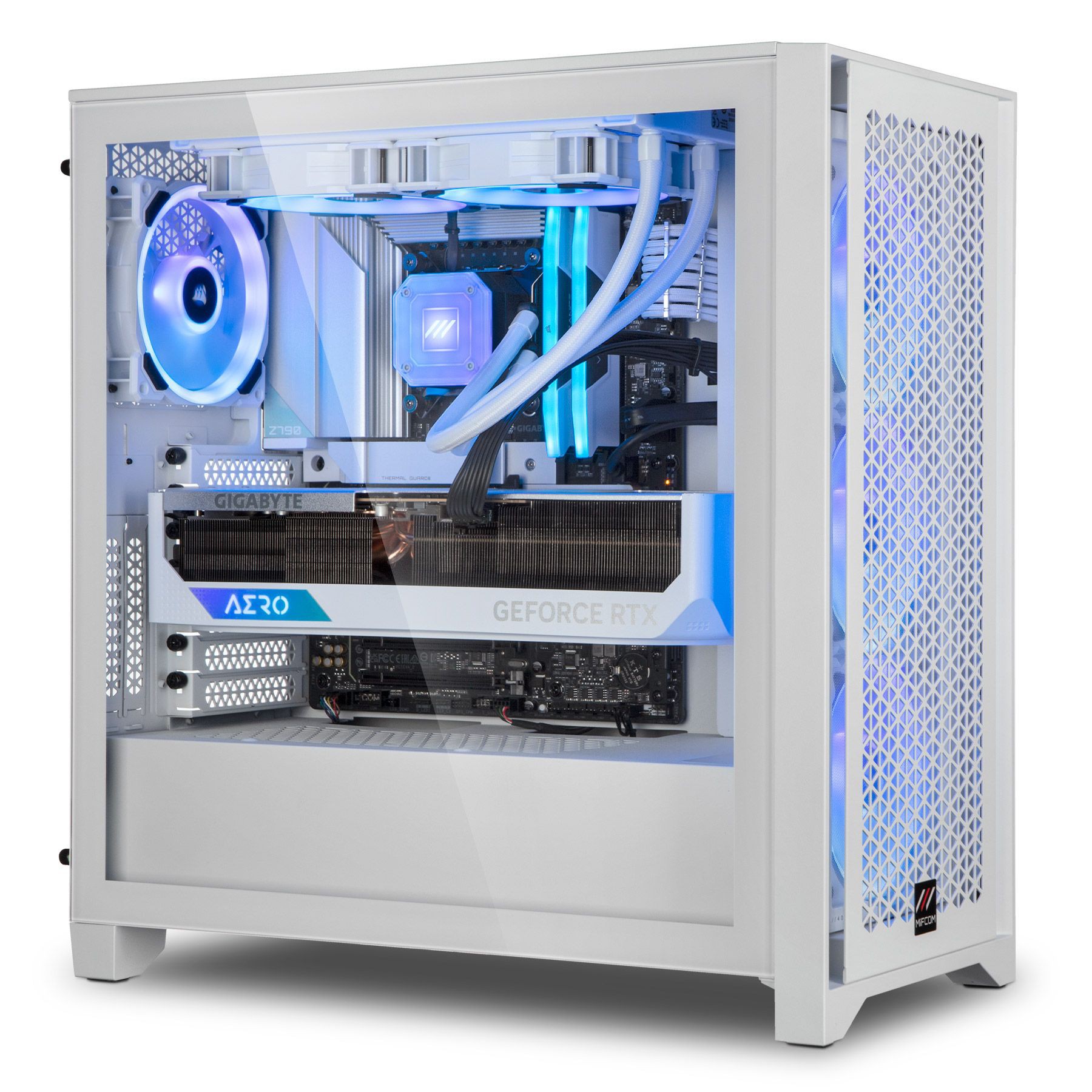 Ein Beispiel für einen schnellen MIFCOM-Rechner mit Corsair-Komponenten ist der High-End-PC Core i7-13700K – RTX 4080, der unter anderem auf eine Corsair iCUE H100i RGB Elite sowie zwei 16-Gigabyte-Riegel DDR5-6000 Corsair Vengeance RGB setzt. Außerdem an Bord: ein Intel Core i7-13700K auf einem Gigabyte Z790 Aero G, eine GeForce RTX 4080 16GB Aero von Gigabyte sowie eine Samsung 980-PRO-SSD mit einem Fassungsvermögen von 1 TB. Vom Chassis über die Grafikkarte bis hin zur sichtbaren Verkabelung sind alle wichtigen Bauteile in Weiß gehalten. Der Rechner ist mit dieser Ausstattung aktuell für 3.999 Euro im Shop von MIFCOM erhältlich.