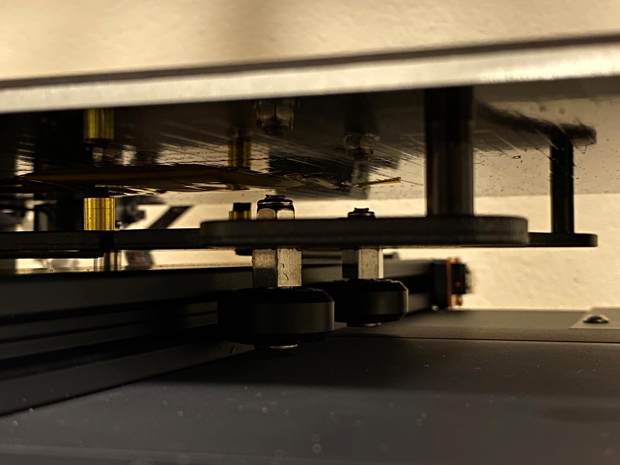 Die Fixierung des Druckbetts läuft über vier Spannrollen. Die von vorne betrachtet rechts befindlichen Spannrollen sind verstellbar. Beim Druckkopf sind die unteren beiden verstellbar und bei der Z-Achse die beiden innenliegenden Spannrollen.