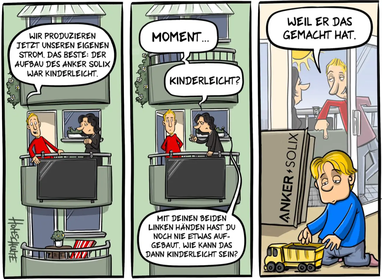 Unabhängig davon, für welches Balkonkraftwerk-Bundle sich KaufinteressentInnen entscheiden, der Aufbau ist wie im Cartoon beschrieben – kinderleicht! Dazu einfach Aufstellort auswählen, innerhalb kürzester Zeit die Solarmodule selbst installieren und mit dem Wechselrichter sowie Schuko-Stecker mit den Paneelen verbinden. Mithilfe der Anker-App (erhältlich für iOS und Android) ist die erzeugte Strommenge stets im Blick. Gerade bei DIY-Projekten scheint nicht immer die Sonne – damit niemand im Regen steht, gibt es für sorgenfreies Stromsparen den hervorragenden Anker-Service (aktuell ein Service-Point für Anker SOLIX in Frankfurt, E-Mail sowie Hotline-Support an Werktagen) und die XXL-Garantieleistungen (zwölf Jahre auf die Solarpaneele, zehn Jahre für den Mikroinverter und zum Beispiel 30 Jahre Performance-Garantie beim Premium-Modell).