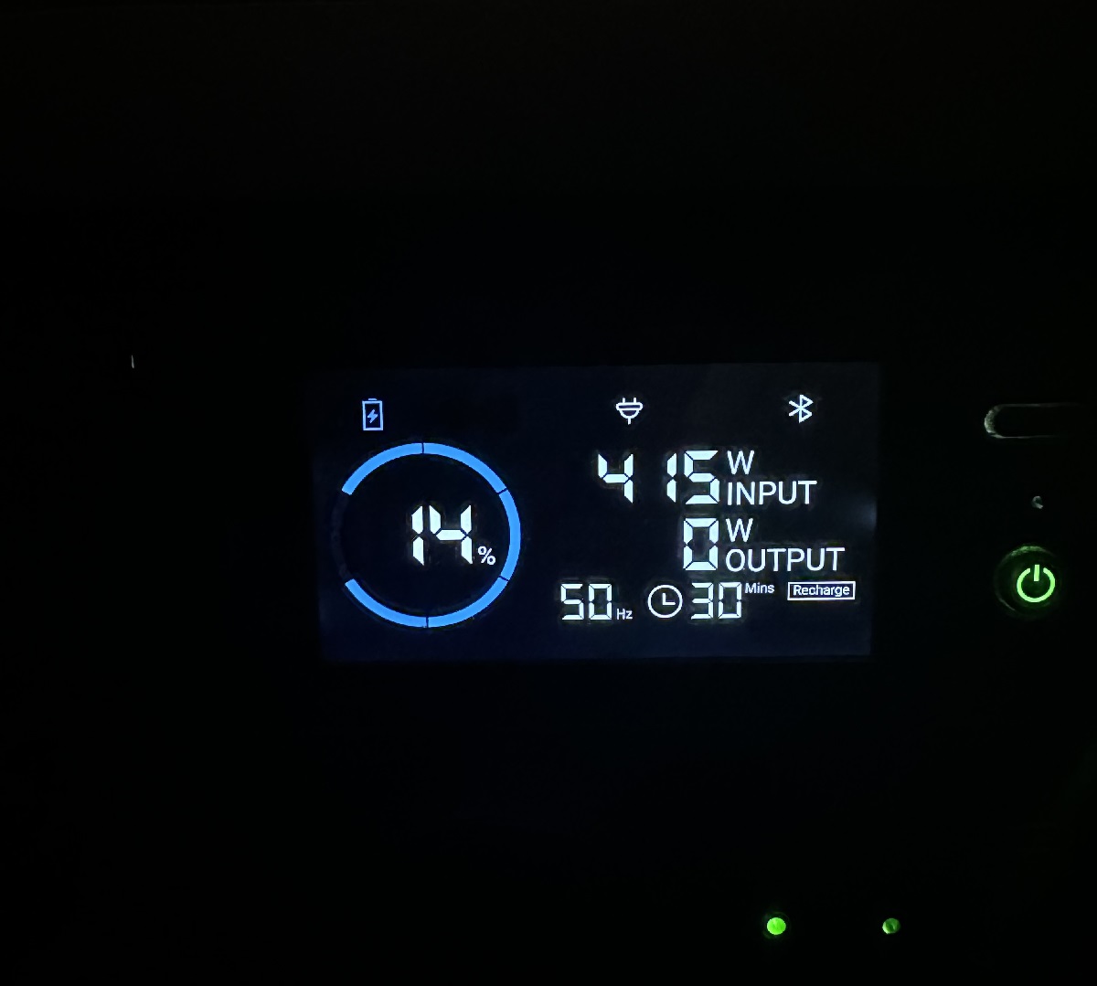 Wird die Powerstation als USV genutzt oder einfach nach dem vollständigen Laden an der Steckdose angeschlossen belassen, drehen die Lüfter ebenfalls unregelmäßig auf, obwohl das Gerät eigentlich nicht arbeiten sollte. In diesem Zustand kann der AC-Wandler nicht deaktiviert werden. Dies geht nur, wenn kein Eingangskabel angeschlossen wird. Dadurch verbraucht das Gerät in diesem Zustand dauerhaft etwa 13 Watt. Der Verbrauch stieg kurzfristig aber sogar auf 60 Watt an, ohne dass ein Verbraucher angeschlossen wurde. Dies dürfte auch mit dem Verbrauch der angesprungenen Lüfter zu tun haben, erklärt den hohen Verbrauch aber nicht vollständig.