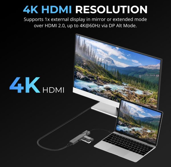 Extend or mirror to an external display via the HDMI 2.0 output port at up to 4K@60 Hz. Requires a USB-C host device with DisplayPort Alternate Mode (DP Alt Mode). Easily and quickly get more screen real estate.
