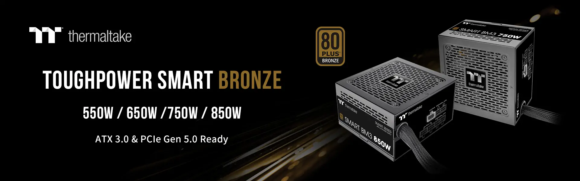 Taipei, Taiwan-August 15th, 2023-Thermaltake, the leading PC DIY premium brand for Case, Power, Cooling, Gaming peripherals, and enthusiast Memory solutions, is thrilled to announce the launch of the Smart BM3 Bronze series, an ATX 3.0 power supply from Thermaltake’s popular Smart Bronze series. The Smart BM3 Bronze features a compact size with a dimension of 150mm(W)x86mm(H)x140mm(D), and it is available in 550W, 650W, 750W, and 850W. To provide maximum compatibility with next-gen and entry graphics cards, the Smart BM3 Bronze meets ATX 3.0 specifications, 12+4pin PCIe Gen 5.0 ready, and supports an ample number of 8-pin connectors. Built-in with Japanese main electrolytic capacitors and 80 PLUS Bronze efficiency, the Smart BM3 Bronze is an ideal semi-modular power supply with high stability.