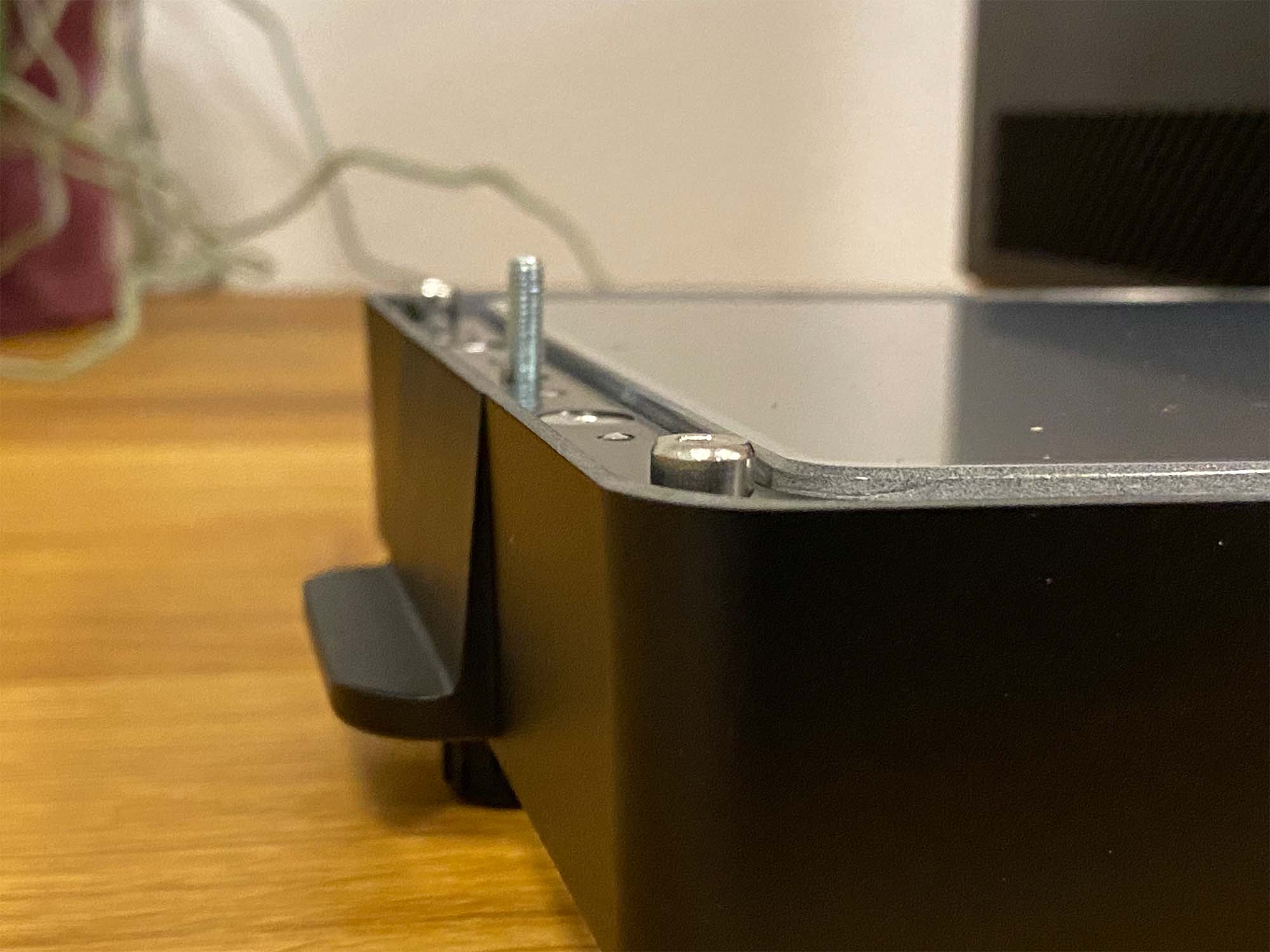Danach kann der Harztank direkt auf den LCD-Schirm gesetzt werden. Für die korrekte Positionierung und ein sicheres Einrasten helfen die vier herausragenden Schraubenköpfe auf der Unterseite des Harztanks. Durch diese Erhöhung wird die PFA-Folie etwas geschützt, sollte der Tank abseits des Druckers auf eine Unterlage gestellt werden. Nachdem der Harztank korrekt auf dem LCD-Schirm gesetzt wurde, müssen nur noch die beiden Rändelschrauben handfest angezogen werden.