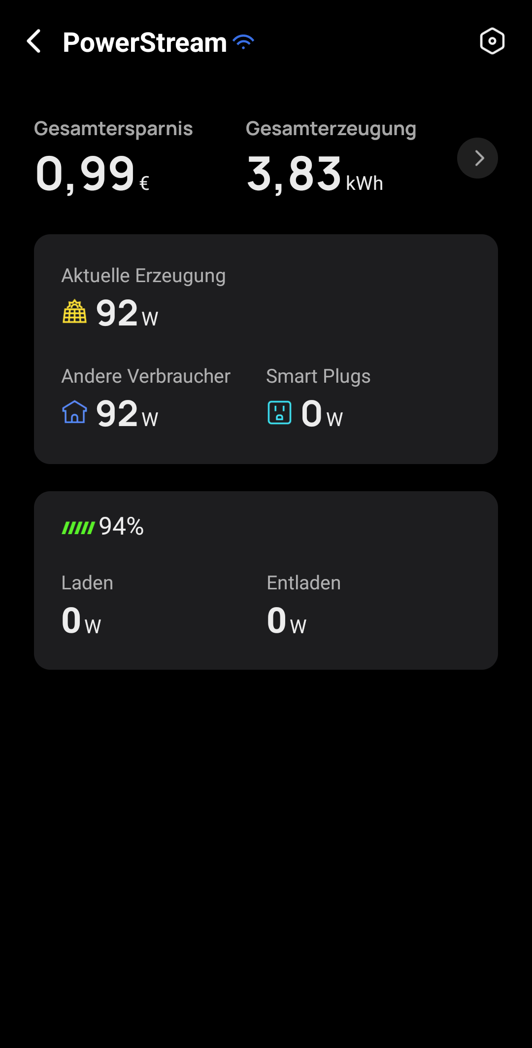 Dreh- und Angelpunkt für die Konfiguration und Überwachung des Ecoflow PowerStream ist die Ecoflow-App. Auf der Geräte-Übersichtsseite werden alle verknüpften Geräte angezeigt. Bei Auswahl des PowerStream Systems werden die aktuellen Energiedaten in Echtzeit angezeigt. Sowohl die aktuell erzeugte Solarleistung als auch die gesamte erzeugte Leistung des Tages sind dort ersichtlich. Hinterlegt man in der App seine aktuellen Energiekosten pro Kilowattstunde, wird oben links angezeigt, wie viel Geld man eingespart hat. Ebenfalls ist zu sehen, ob und mit welcher Leistung der Speicher geladen oder entladen wird und wie viel Watt in das Hausnetz eingespeist werden.