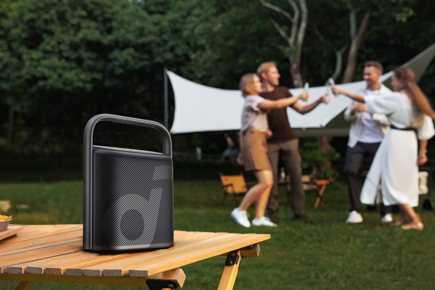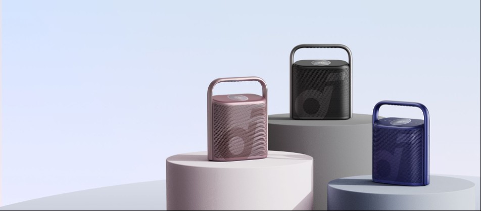 Der Speaker verfügt über ein elegantes Aluminiumgehäuse mit mattem Finish und ist in drei verschiedenen Farben erhältlich: Schwarz, Blau und Rosa. Der Sky Channel oben auf dem Gerät ist mit LED-Lichtern ausgestattet und durch eine dynamische Beleuchtung akzentuiert. Je nach gewähltem Equalizer-Modus leuchtet er in unterschiedlichen Farben und lässt sich sogar über die soundcore-App individuell anpassen. Der ikonische Handgriff sorgt dafür, dass der Motion X500 mühelos tragbar ist.