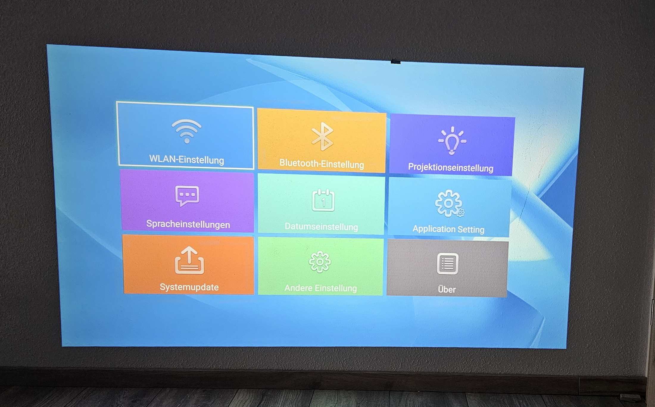 Wenn ihr hofft, dass eine LED sofort die volle Helligkeit erreicht – das stimmt, eine Vorwärmzeit wie bei Beamern mit Halogen-Leuchtmitteln gibt es nicht. Dafür bootet Android und das dauert ganze 35 Sekunden. Hinzu kommen noch die Bildkorrekturmessungen.
