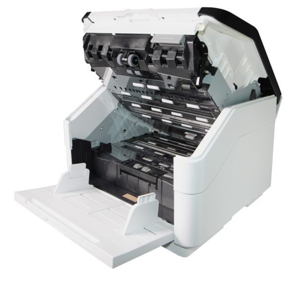 Darüber hinaus ermöglicht der Avision AD8150 dem Anwender die Papierzuführung sowohl auf herkömmlichem wie auch auf geradem Papierwege und eignet sich daher für vielseitige Arbeitsumgebungen. Wird die hintere Abdeckung des Avision AD8150 Scanners geöffnet, so lässt sich der gerade Papierweg verwenden und die Vorlage direkt zur Rückseite transportieren.
