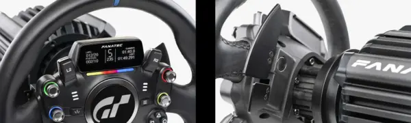 The wheel has RGB lighting on the directional sticks, FlagLEDs, and RevLEDs, and a 2.7” OLED display. Premium vegan leather and ergonomic grips make the 300 mm diameter wheel feel comfortable and much like a real GT road car, and the magnetic shifters enhance the realism even further.