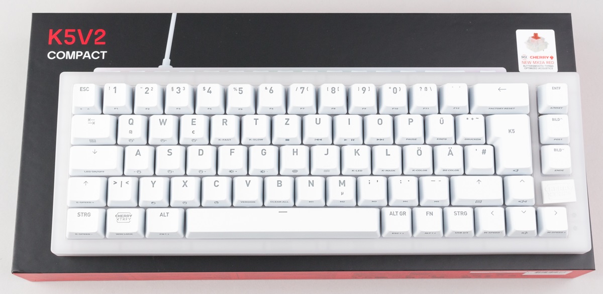 Anwendern, die ansonsten von der Tastatur überzeugt sind, empfehlen wir daher die Verwendung des Custom Keyboard Builders von Cherry. Dort kann die K5V2 mit PBT-Keycaps in unterschiedlichen Designs, mit unterschiedlichen Switches und weiteres Extras individuell zusammengestellt werden. Gegenüber der Retailversion kostet dies allerdings einen Aufpreis, selbst wenn die identischen Komponenten gewählt werden.