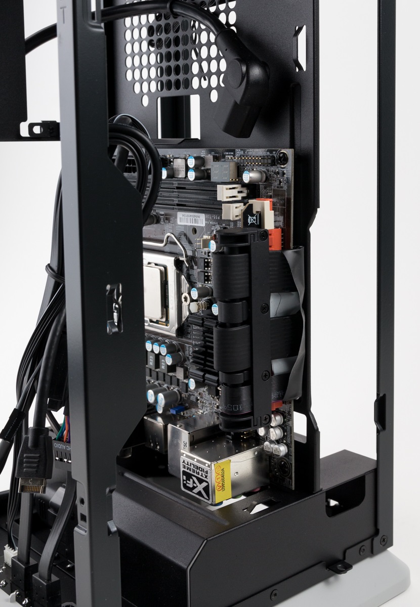 SFX oder SFX-L Netzteil werden mittig unter dem großen Lüfter befestigt. Der Stromanschluss wird durch das vorverlegte Kabel nach unten zum Gehäuse geführt.