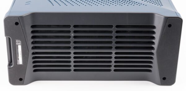 Die Unterseite zeigt, dass das Gehäuse zwei durchgängige Bereiche als Standfüße besitzt, welche leicht gummiert wurden. Die mittigen Lüftungslöcher sind leicht nach oben versetzt, damit dort Frischluft angezogen werden kann. In diesem Bereich wurde zudem ein großer Staubfilter vorinstalliert, der bei dem Gehäuse noch eine Sonderfunktion besitzt.