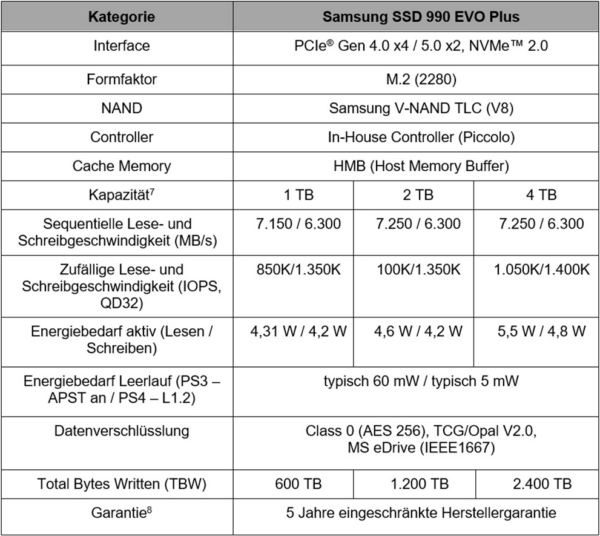 Specs: Samsung NVMeTM SSD 990 EVO Plus mit 1 TB, 2 TB und 4 TB