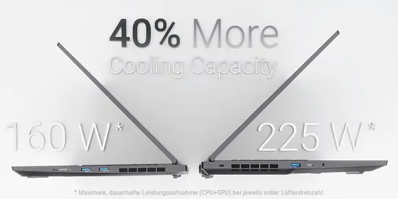 Dank der bewusst nicht-ultra-schlanken Bauweise kann das Stellaris 16 nicht nur alle vier GPUs mit der jeweils höchsten Leistungsstufe (TGP) von bis zu 175 Watt, sondern auch den Core i9-14900HX mit einer sehr hohen TDP von bis zu 125 Watt betreiben.