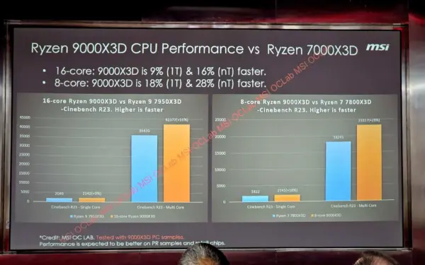 Nachdem letzte Woche die Taktraten des Ryzen 7 9800X3D im Cinebench aufgetaucht waren, ist jetzt die Quelle offenbart. MSI hat einigen Partnern etliche Informationen der kommenden Gaming-Prozessoren von AMD gezeigt. Dazu gehörten auch Vergleiche der Ryzen 9000X3D mit der Vorgängergeneration sowie den normalen 9000ern. Diese sind nun ebenfalls durchgesickert.