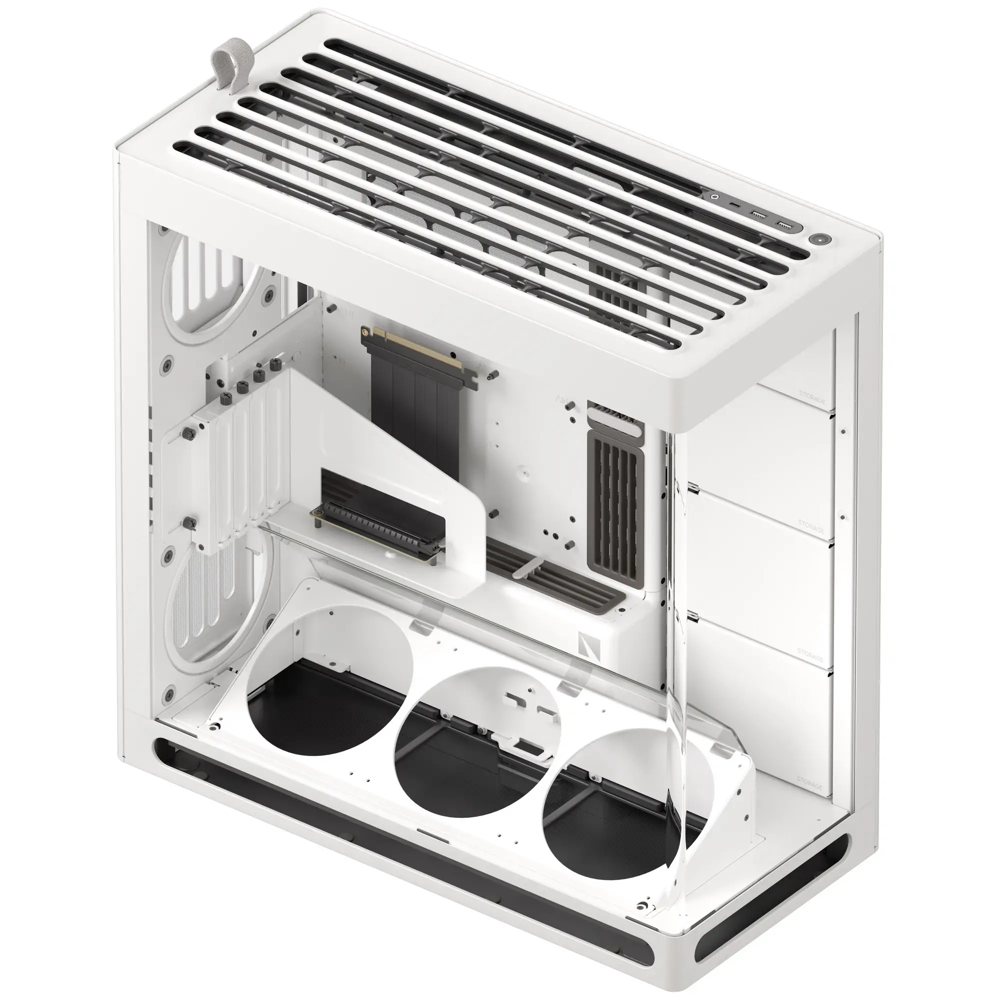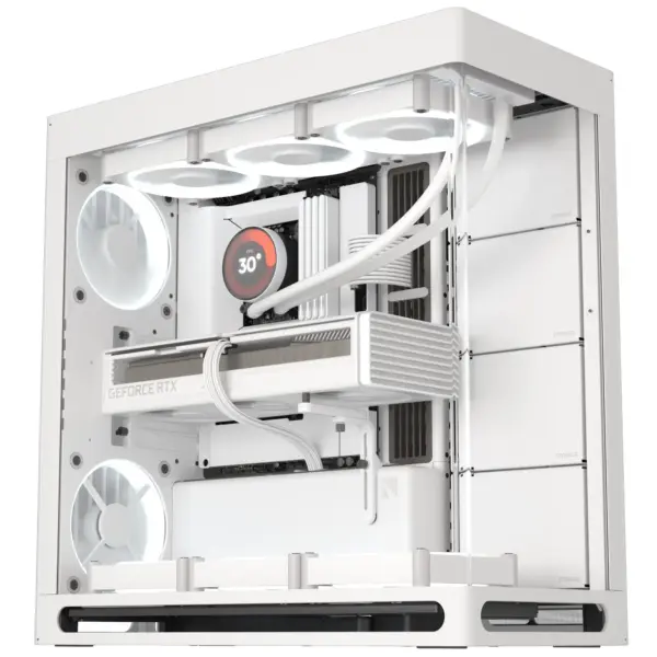 In der VGPU Edition sind zusätzlich das VGPU-Montageset und ein PCI Express® 5.0 X16 Riser-Kabel enthalten mit der die Grafikkarte in aufrechter Position verbaut wird. Das ebenfalls enthaltene Bracket bringt die Intake-Lüfter in eine angewinkelte Position und führt den Luftstrom direkt auf die GPU. Zusätzlich stellt der in den Gehäuseboden integrierter Hohlraum mit großzügigen Lufteinlässen an den Seiten jederzeit ausreichende Frischluftzufuhr sicher.