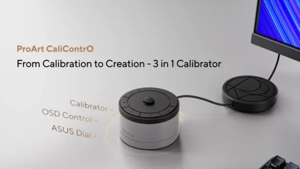 Der vielseitige ProArt CaliContrO MCA02 3-in-1-Kalibrator arbeitet mit ASUS exklusiven Apps für die Hardware- und Softwarekalibrierung kompatibler ProArt-Displays. Er kann an einen kompatiblen Monitor angeschlossen werden, um direkten Zugriff auf das On-Screen-Display (OSD) für schnelle Anpassungen zu ermöglichen, und unterstützt Vibrationsrückmeldung. Der Kalibrator bietet eine sofortige und präzise Steuerung von Adobe Apps und anderen Anwendungen, indem er Tastenkombinationen ermöglicht. Maßgeschneiderte Tastenkombinationen ermöglichen es Benutzern, Bilder zu vergrößern und zu verkleinern oder die Pinselgröße schnell anzupassen, indem sie einfach das integrierte Drehrad von ASUS verwenden. Die Standardschnittstelle kann sogar an bestimmte Arbeitsstile angepasst werden.