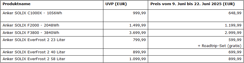 Der Anker SOLIX EverFrost 2 in der 23-Liter-Variante wird zu einer UVP von 799,99 EUR angeboten. Zum Start des Summer Sales gibt es ihn vom 9. bis zum 22. Juni 2025 inklusive Roadtrip-Set zum Angebotspreis von 599,99 EUR.