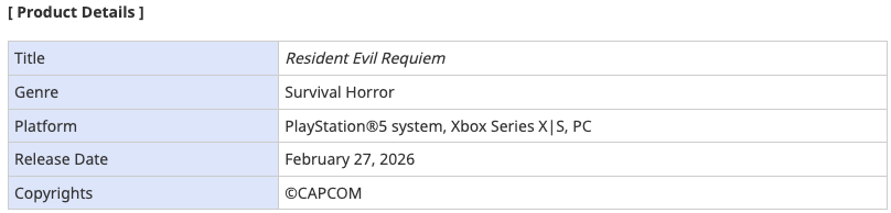 Capcom Co., Ltd. (Capcom) today announced that Resident Evil Requiem, the latest title in the Resident Evil series, is scheduled for release on February 27, 2026.