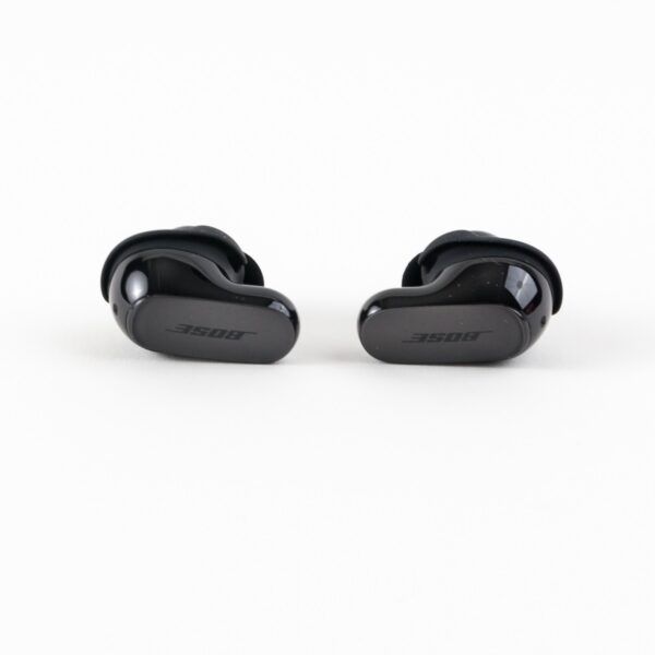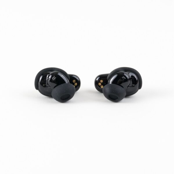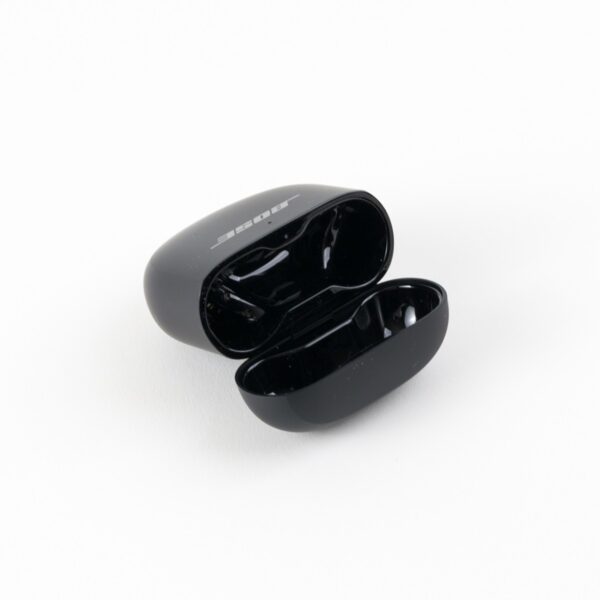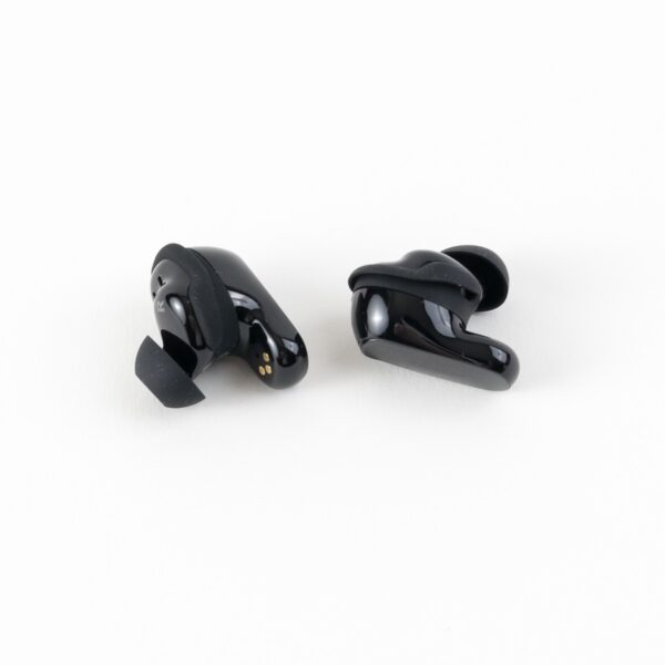 Die Bose QuietComfort Ultra Earbuds sind klein und knubbelig. Sie besitzen Silikonbereiche an den Enden, für die im Lieferumfang zwei weitere Größen beiliegen. Sie wurden in fast allen Bereichen mit einer glänzenden Oberfläche ausgestattet.