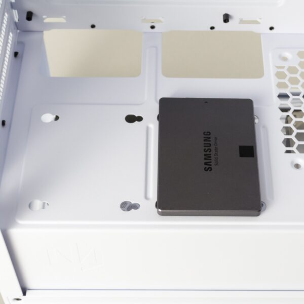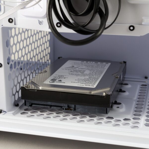 Festplatten und SSDs werden in dem Gehäuse identisch verbaut. Sie werden mit Gummierungen und vier Schrauben versehen und können so in verschiedenen Bereichen des Gehäuses eingerastet werden. Für 3,5-Zoll-Festplatten ist nur ein Platz vorgesehen, dieser befindet sich im unteren Teil vor dem Netzteil.
