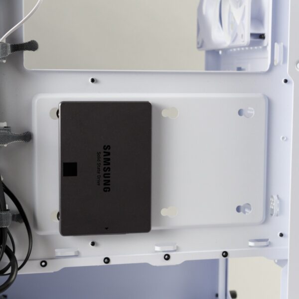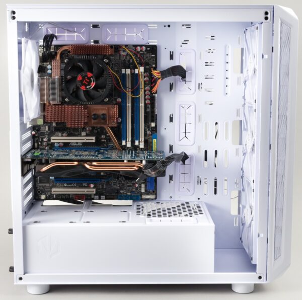 Das Gehäuse bietet die Möglichkeit, viele Kabel auf der Rückseite zu verstauen und so einen cleanen Innenraum zu schaffen. Im Innenraum sind zudem kaum Schrauben ersichtlich, die bei dem Gehäuse leider alle in schwarz gehalten wurden. Soll dagegen ein bewusster Schwarz-Weiß-Kontrast geschaffen werden, können die vorinstallierten weißen Gummierungen für die Kabeldurchführungen durch schwarze Exemplare ersetzt werden.