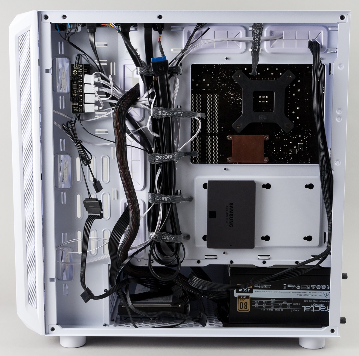 Das Gehäuse bietet die Möglichkeit, viele Kabel auf der Rückseite zu verstauen und so einen cleanen Innenraum zu schaffen. Im Innenraum sind zudem kaum Schrauben ersichtlich, die bei dem Gehäuse leider alle in schwarz gehalten wurden. Soll dagegen ein bewusster Schwarz-Weiß-Kontrast geschaffen werden, können die vorinstallierten weißen Gummierungen für die Kabeldurchführungen durch schwarze Exemplare ersetzt werden.