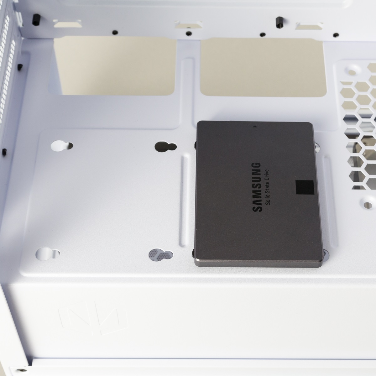 Festplatten und SSDs werden in dem Gehäuse identisch verbaut. Sie werden mit Gummierungen und vier Schrauben versehen und können so in verschiedenen Bereichen des Gehäuses eingerastet werden. Für 3,5-Zoll-Festplatten ist nur ein Platz vorgesehen, dieser befindet sich im unteren Teil vor dem Netzteil.
