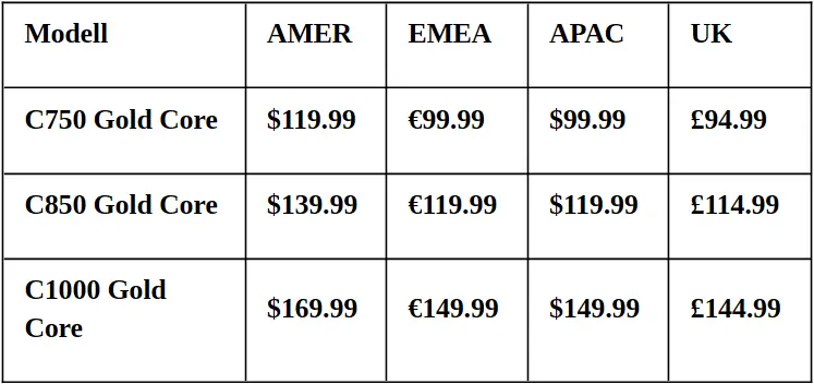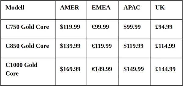 - C850/C1000 Gold Core enthält 3x 6+2-Pin PCIe-Stromkabel mit einem 600W 12V-2×6-Kabel.