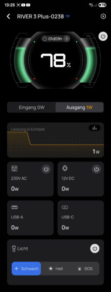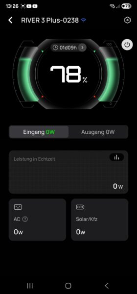 Wie erwähnt verfügt die Ecoflow River 3 Plus über Bluetooth und WLAN und kann so auch ohne Internet bzw. Hotspot mit dem Smartphone oder Laptop überwacht werden. Es ist sogar möglich, die gesamte Powerstation übers Smartphone abzuschalten, man kann aber auch einzelne Ausgänge gezielt schalten.