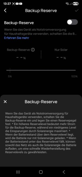 Wer möchte, kann bei einem Netzausfall über ein blinkendes Display darauf aufmerksam gemacht werden, beispielsweise wenn die Powerstation als USV dient. Dafür gibt es auch die Einstellung einer Backup-Reserve, die nur bei einem Netzausfall genutzt werden darf. Wer Routinen für das Laden oder Entladen erstellen möchte, kann dies ebenfalls über die App machen.