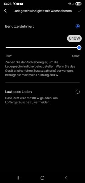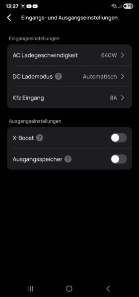 Über diverse Einstellungen können die maximal nutzbaren SOC-Grenzen stufenlos konfiguriert werden. Auch die AC-Eingangsleistung ist nahezu beliebig zwischen 80 und 640 Watt anpassbar. Allerdings ist das nicht zwangsweise auch die Energie, die in den Akku geladen wird. Von dem Wert muss man die eventuell angeschlossenen DC-Lasten abziehen, Geräte über AC hingegen werden zusätzlich drauf addiert.