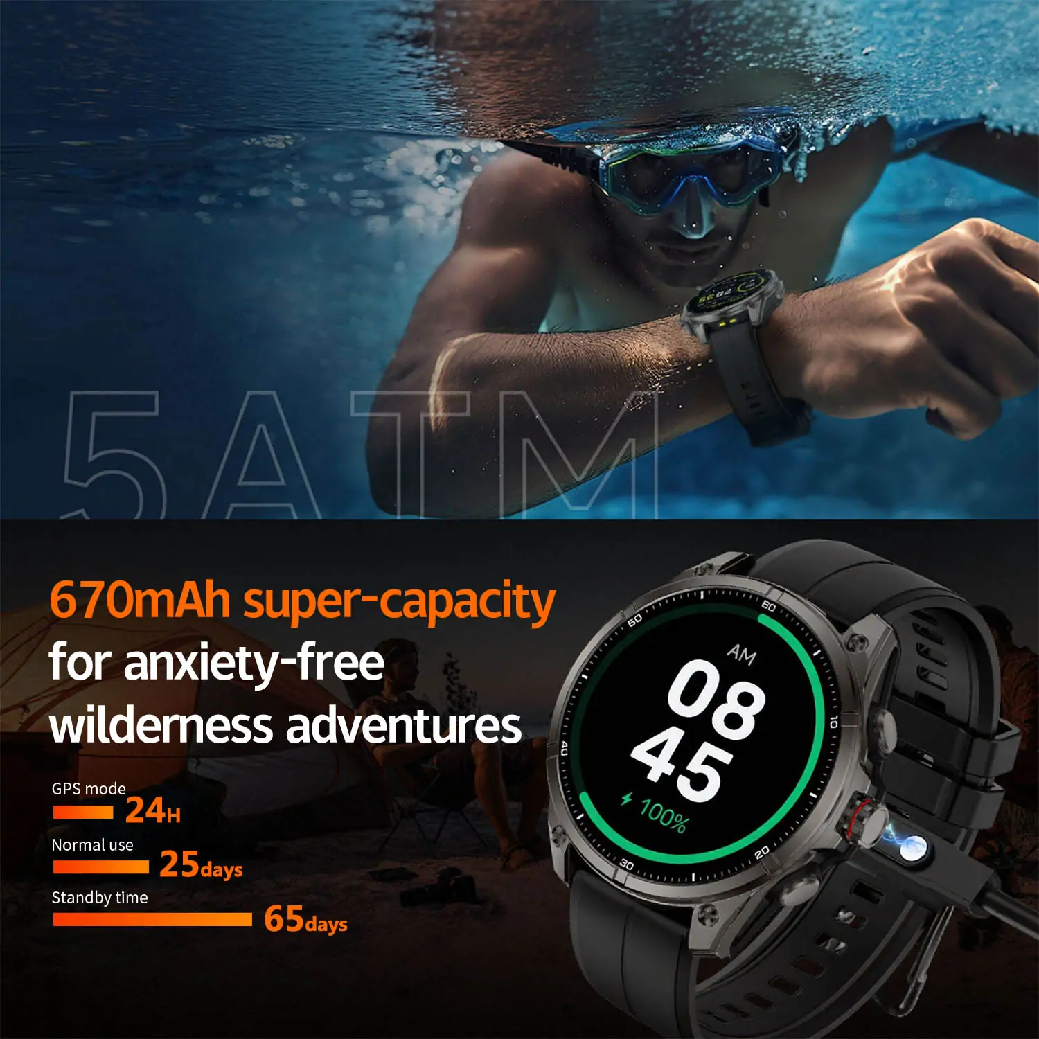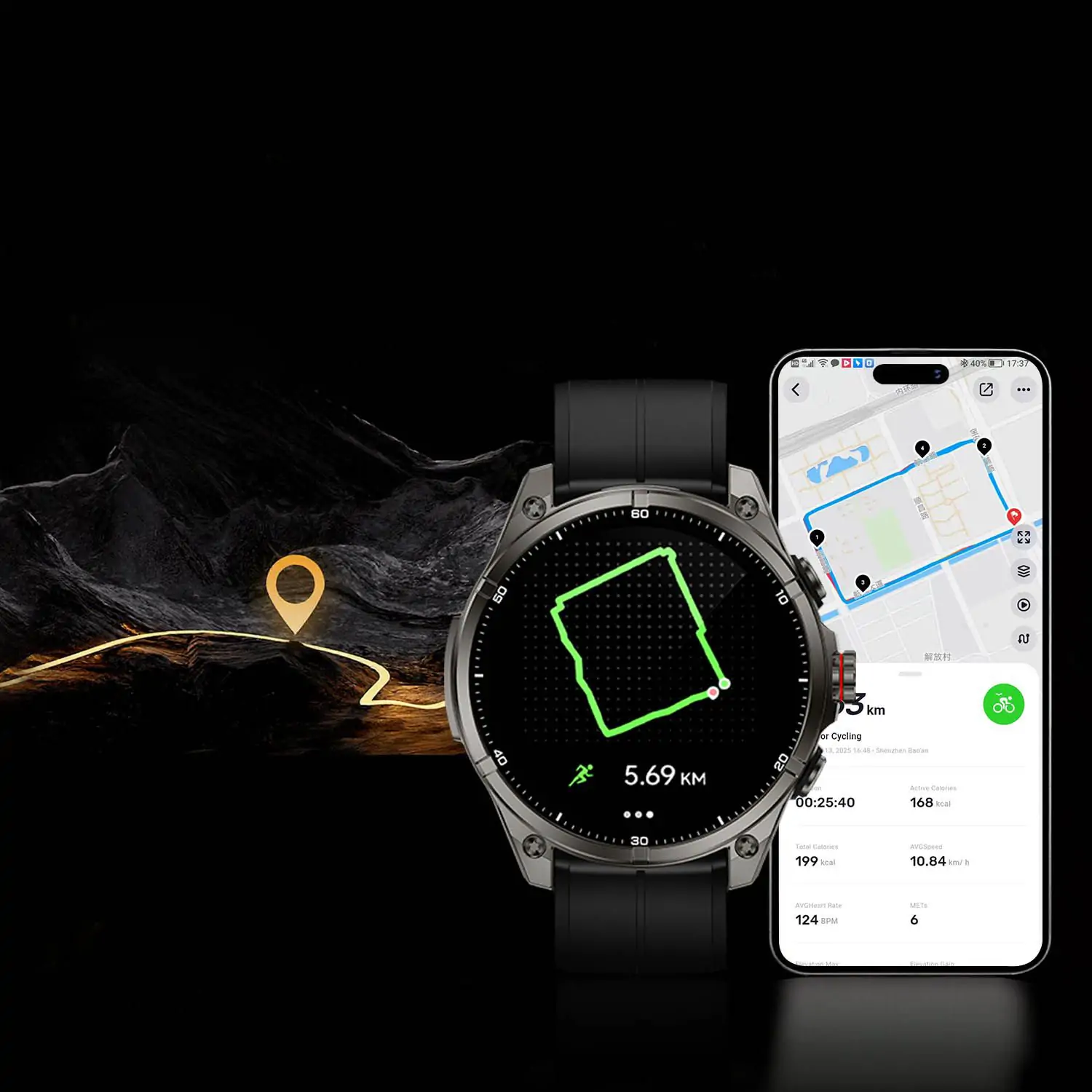 The smartwatch features a stunning 1.43-inch AMOLED display with a peak brightness of 1000 nits for crisp visibility even under direct sunlight. Three physical buttons complement the touchscreen, making it effortless to navigate menus and functions while on the move. With Bluetooth calling and instant message notifications, the Rogbid Apex FT keeps you connected wherever your adventures take you.