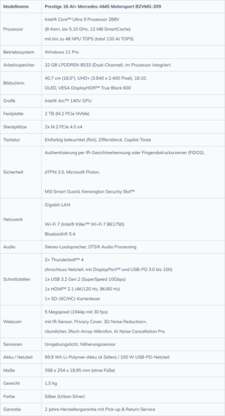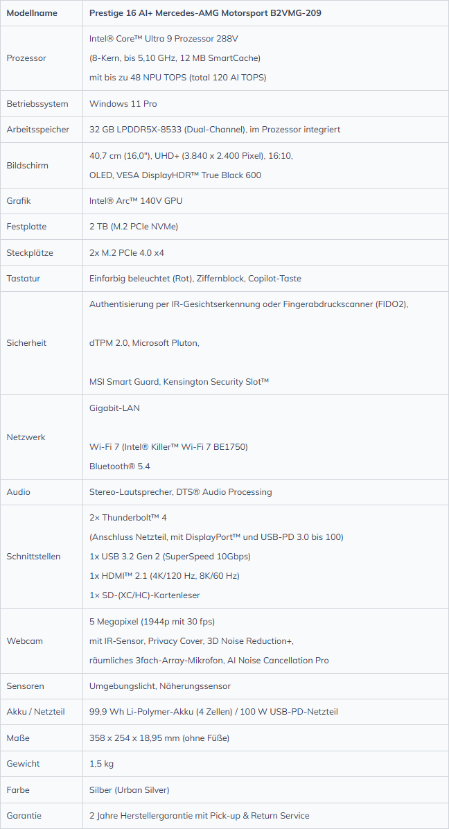 Der Prestige 16 AI+ Mercedes-AMG Motorsport Edition besticht durch ein exklusives Design, das von der charakteristischen AMG-Farbpalette aus Grau, Silber und roten Akzenten inspiriert ist und durch präzise lasergravierte AMG-Motorsport-Logos veredelt wird. Das Modell ist ab sofort bei notebooksbilliger.de und im MSI e-Shop für 2.199 Euro (unverbindliche Preisempfehlung) erhältlich.