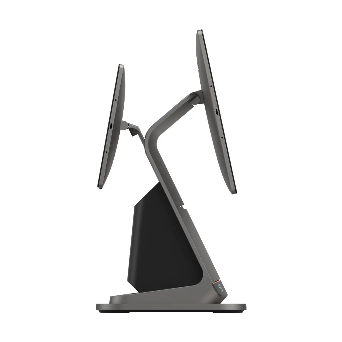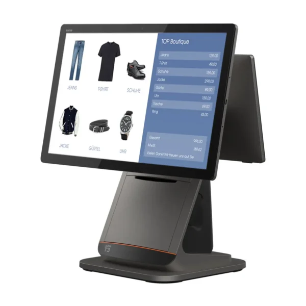 Direkt in das Display ist ein NFC-Reader integriert, mit Fingerprint-Login den oft lästigen „Kellnerschlüssel“ überflüssig macht. SoftPOS ermöglicht bargeldloses Handy- und Kartenzahlen, das Display lässt sich dazu leicht und freundlich mit einem Handgriff 125 Grad dem Kunden zuwenden. Optional lassen sich zudem zwei Kunden-Multitouch-Displays (Full-HD 15,6 und HD 10,1 Zoll) anschließen.