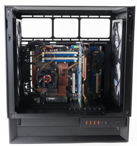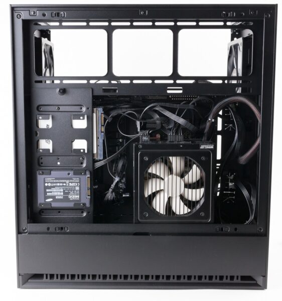 Das Gehäuse bietet auf der Rückseite ausreichend Platz, um die Kabel verstecken zu können. Der Innenraum kann daher sehr clean gehalten werden. Der Einbau eines Radiators oder weiterer Lüfter ist zudem fast Pflicht, weil der obere Bereich ansonsten sehr leer wirkt.