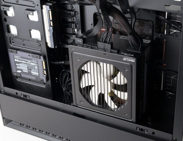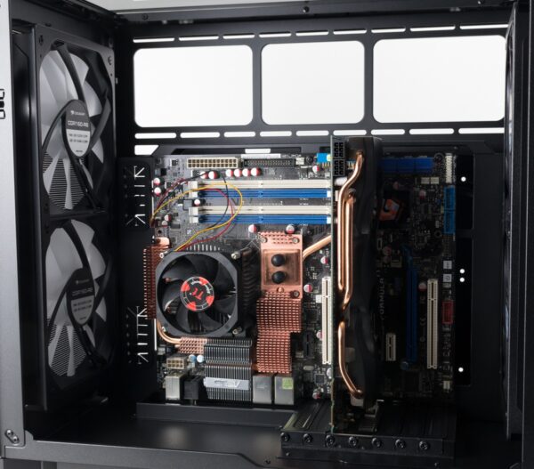 Die Mainboardabstandhalter waren beim Cougar OmnyX bereits vorinstalliert, wodurch der Einbau des Mainboards in dem großen Innenraum keinerlei Probleme machte. Die Grafikkarte wird kopfüber verbaut und kann alternativ auch um 90 Grad gedreht werden. Das dafür benötigte Riser-Kabel muss allerdings zusätzlich erworben werden.