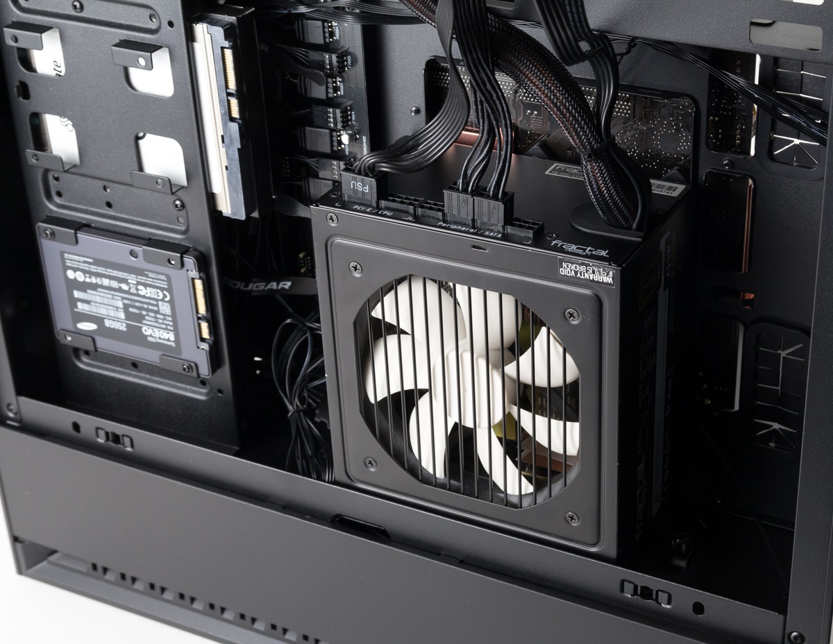 Das Gehäuse bietet auf der Rückseite ausreichend Platz, um die Kabel verstecken zu können. Der Innenraum kann daher sehr clean gehalten werden. Der Einbau eines Radiators oder weiterer Lüfter ist zudem fast Pflicht, weil der obere Bereich ansonsten sehr leer wirkt.
