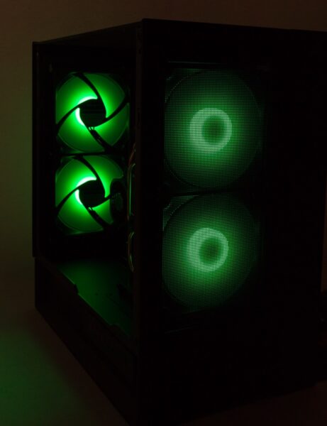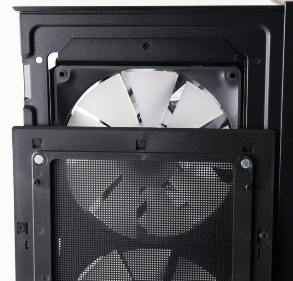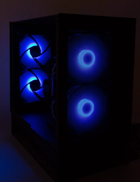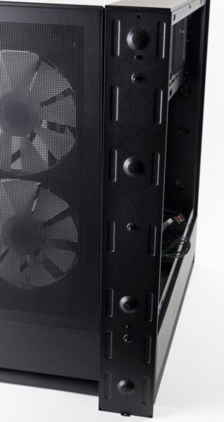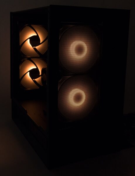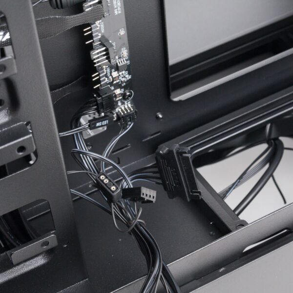 Auf der Rückseite des Gehäuses wurde ein Lüfter- und Beleuchtungs-Hub verbaut sowie die vier mitgelieferten Lüfter bereits angeschlossen. Insgesamt ist Platz für sechs Exemplare, sodass noch zwei Lüfter zusätzlich angeschlossen werden könnten.