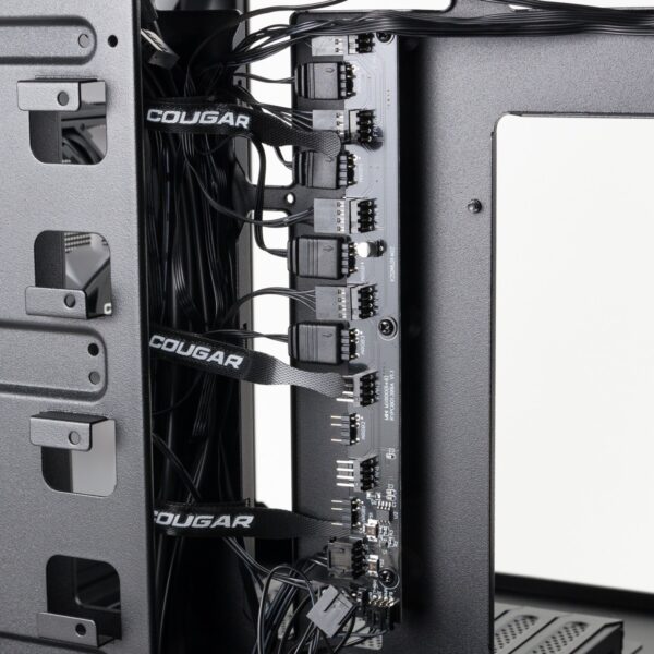 Das Hub besitzt zwei Funktionen. Es bündelt zu Einem die Lüfter, um sie mit jeweils nur einem Kabel für die Steuerung der Lüftergeschwindigkeit und der Beleuchtung am Mainboard anschließen zu können. Zum Anderen ermöglicht das Hub auch die Steuerung der Beleuchtung über den Resetknopf des Gehäuses.