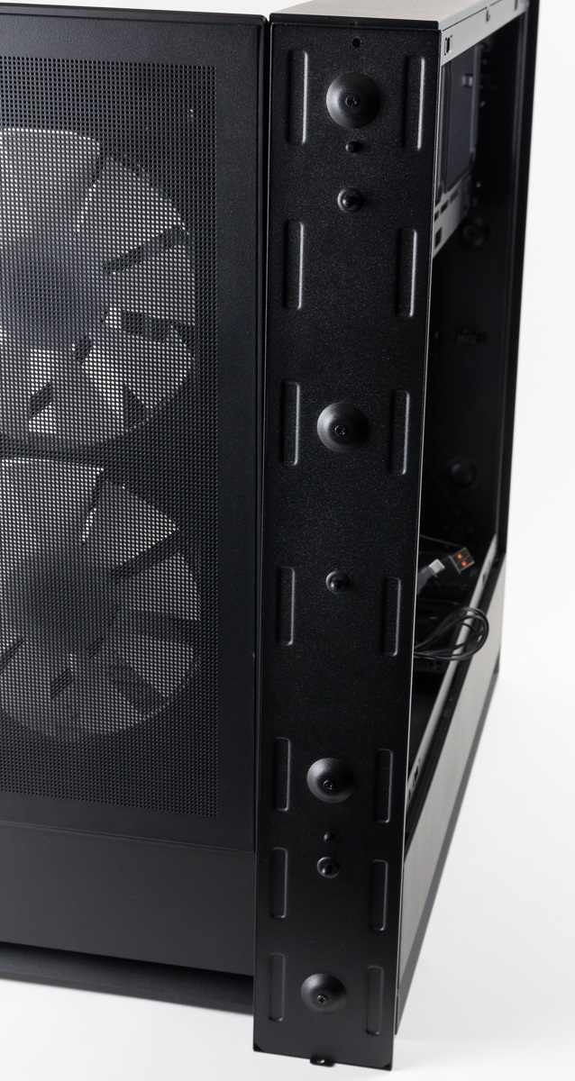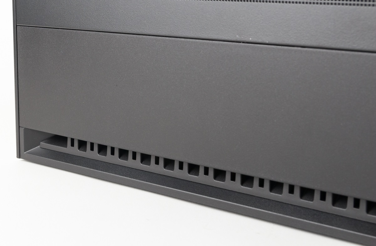 Die Besonderheit des Gehäuses ist zudem die Kabelführung und die dafür vorhandenen Auslässe im Boden. Die Kabel können zu beiden Seiten oder nach hinten geführt werden und sollen so je nach Ausrichtung keine Kabel sichtbar machen.